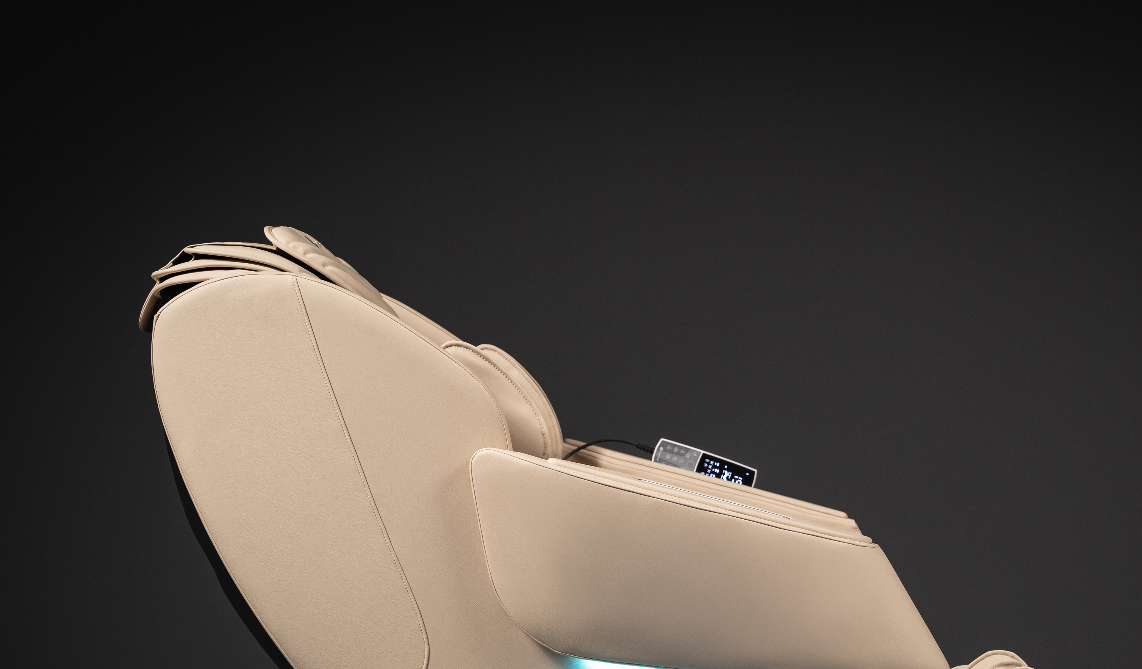 A masszázsfotel bal kartámlájára rögzített távvezérlő biztosítja a fotel irányítását. Az egyszerű használatra tervezett eszköz lehetővé teszi, hogy a masszázs során a felhasználó bármikor irányítsa a folyamatot, beállítsa az alkalmazott eljárást, a fotel dőlési szögét, valamint a masszázs hőterápiával történő kiegészítését. A fotel jobb kartámláján található egy tartórekesz, ahol a felhasználó a masszázs ideje alatt elhelyezheti a távvezérlőt.