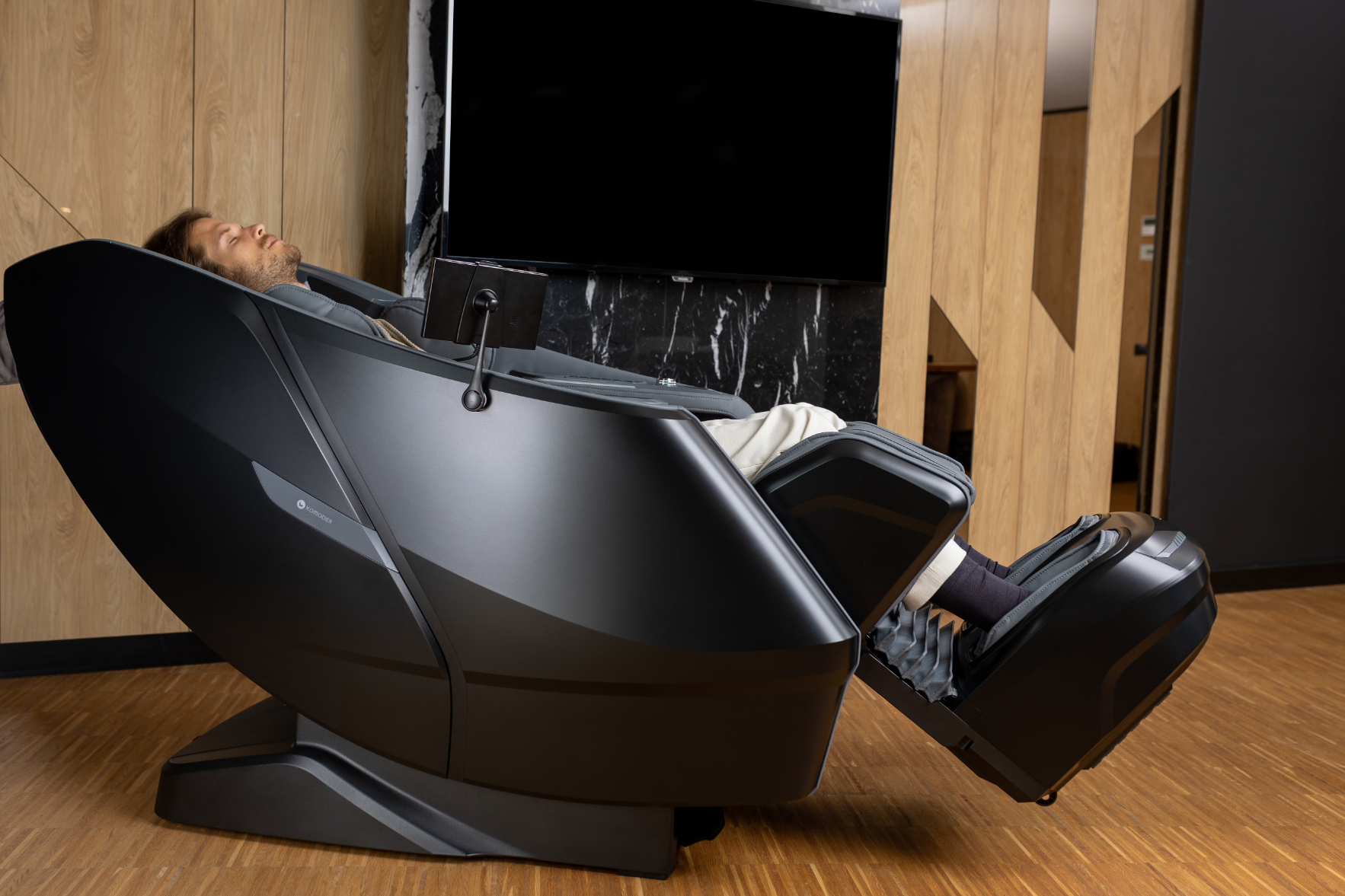 A hangulatvilágítás kellemes módon emeli ki és egészíti ki egy csúcstechnológiás masszázsfotel formatervezését. Megteremti a relaxáló légkört, kiemeli a fotel elegáns vonalait, és plusz vizuális kényelmet biztosít. A finom fényeknek köszönhetően a felhasználói élmény teljesebbé válik, fokozva a luxus és a pihenés érzetét bármely helyiségben.