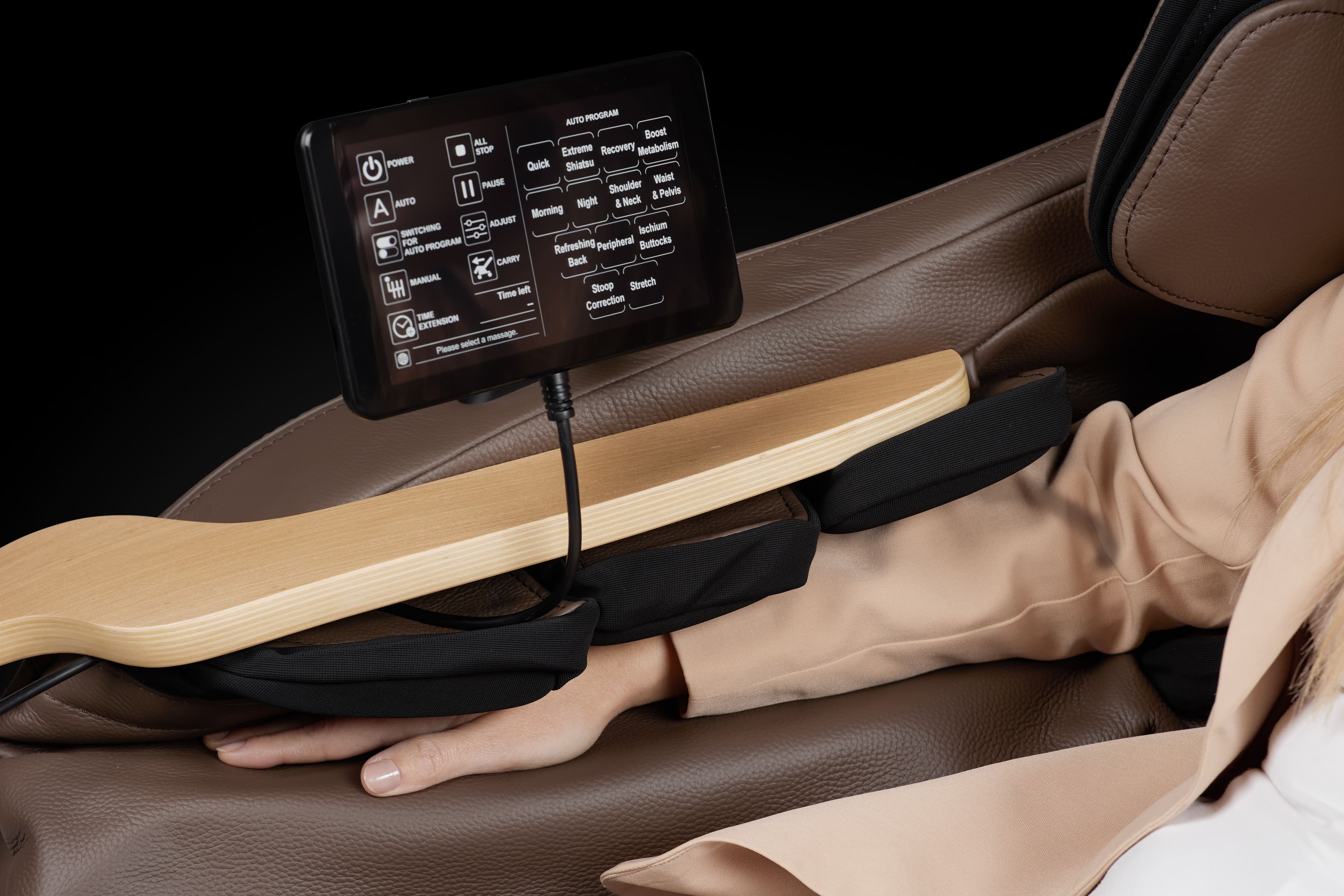 Az érintőképernyő leegyszerűsíti a masszázsfolyamat vezérlését és személyre szabását. A masszázsfotel vezérlése egyszerűvé válik a bal kartámlán található táblagépnek és a gyorsgomboknak köszönhetően, amelyek lehetővé teszik a beállítások gyors módosítását a maximális kényelem eléréséhez.